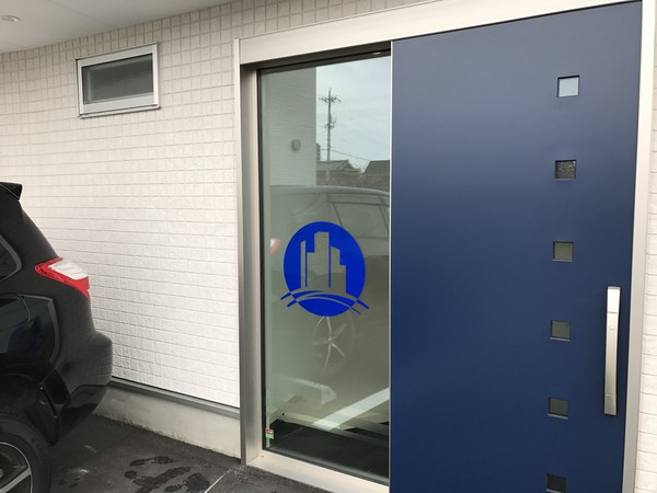 壁面社名プレート看板、駐車場プレート看板、窓ガラスの目隠しフィルム、社名ロゴのウィンドウシートを施工させて頂きました。